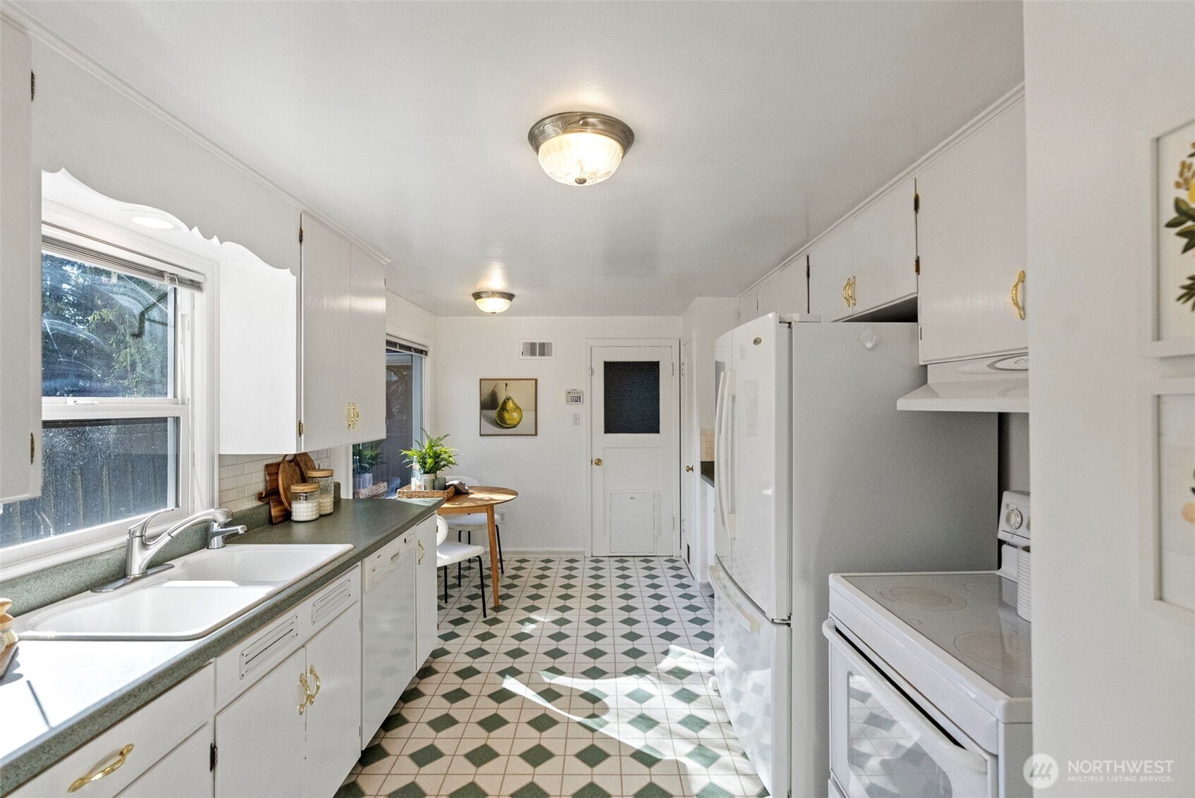 The dedicated dining room rests right alongside the kitchen where you’ll find another spot for a cute bistro table set. Eye-catching details in the kitchen add instant charm, from the tile design on the flooring to the cabinet hardware that sparkles with style.