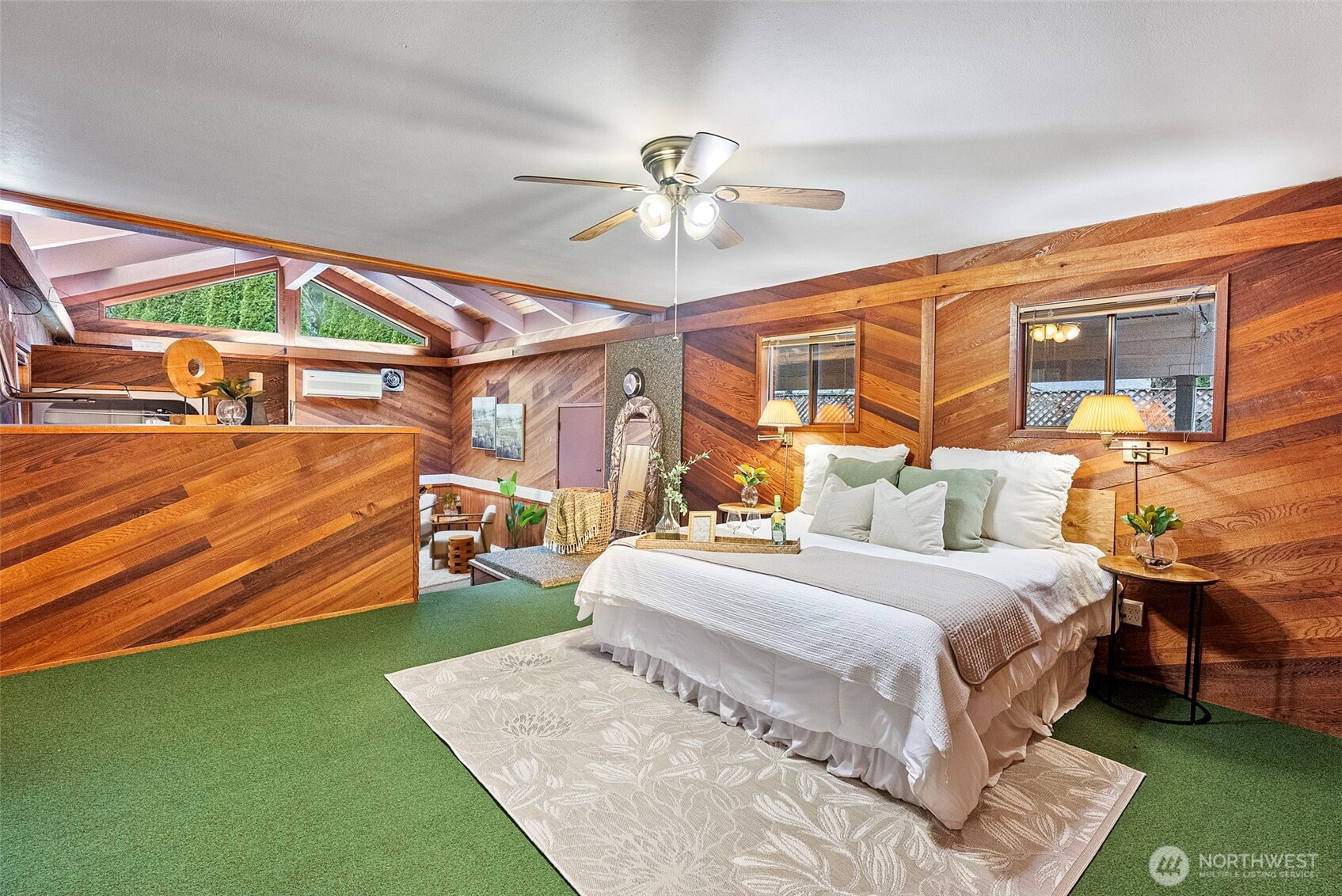On the main level you’ll also find the primary suite, which is every bit beautiful as it is practical. Distinctive design and captivating architecture are ready to impress—in addition to a large bedroom layout, tons of walk-in closet space, built-in organization, and an ensuite bath, the impeccably curated aesthetic is truly exceptional. Sunlight pours in overhead and shines the spotlight on rich wood finishes; it’s absolutely gorgeous!