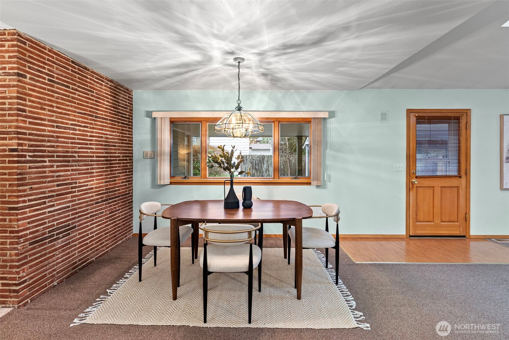 Eye-catching curb appeal offers just a hint of the beauty that awaits both inside and out. The living room radiates comfort and warmth, and natural light cascades in through large windows while the statement-making fireplace shows off mid-century modern charm galore. As you head further into the home, expansive open-concept living beckons. The spacious dining area is right alongside the kitchen, and the massive family room is an absolute delight whether simply relaxing in the peaceful quiet of home, or hosting a crowd for a special occasion! There are even hardwood floors hidden underneath the carpet, just waiting to be uncovered.