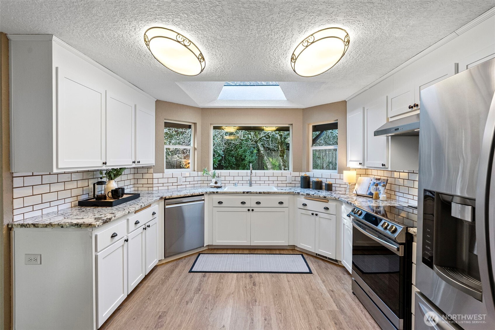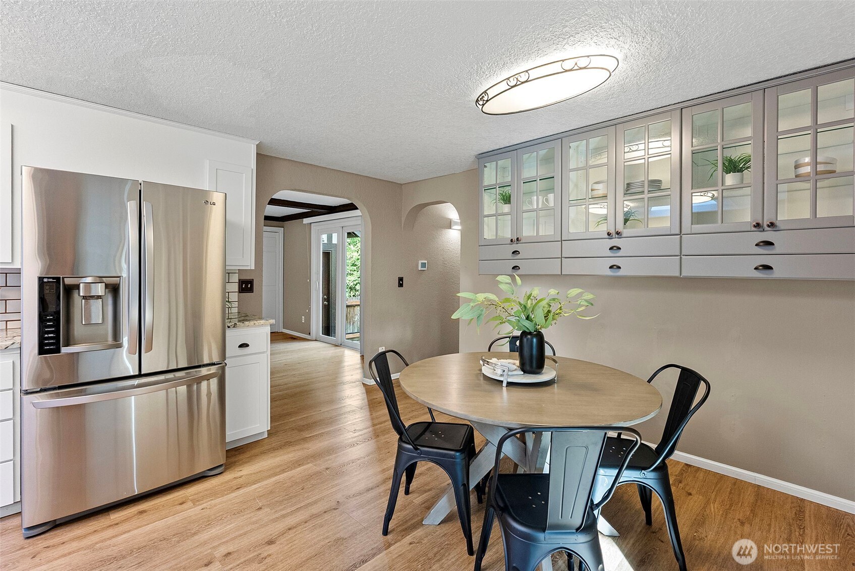 Sparkling with style, the renovated kitchen offers a smart layout and even includes a dining area. Stainless steel appliances, a large bay window that overlooks the park-like backyard, and abundant storage in crisp cabinetry are just a few of the features that make up this perfect package.