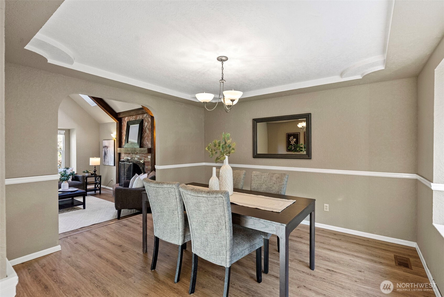 Hosting gatherings large and small is a total joy thanks to the formal living room and formal dining room. In the stunning living room, soaring ceilings boast skylights and beautiful wood beams with a cozy wood-burning fireplace at the center of it all. Newer luxury vinyl plank flooring flows into the adjacent dining room (and throughout the main level), where a tray ceiling with sculpted detailing adds instant elegance.